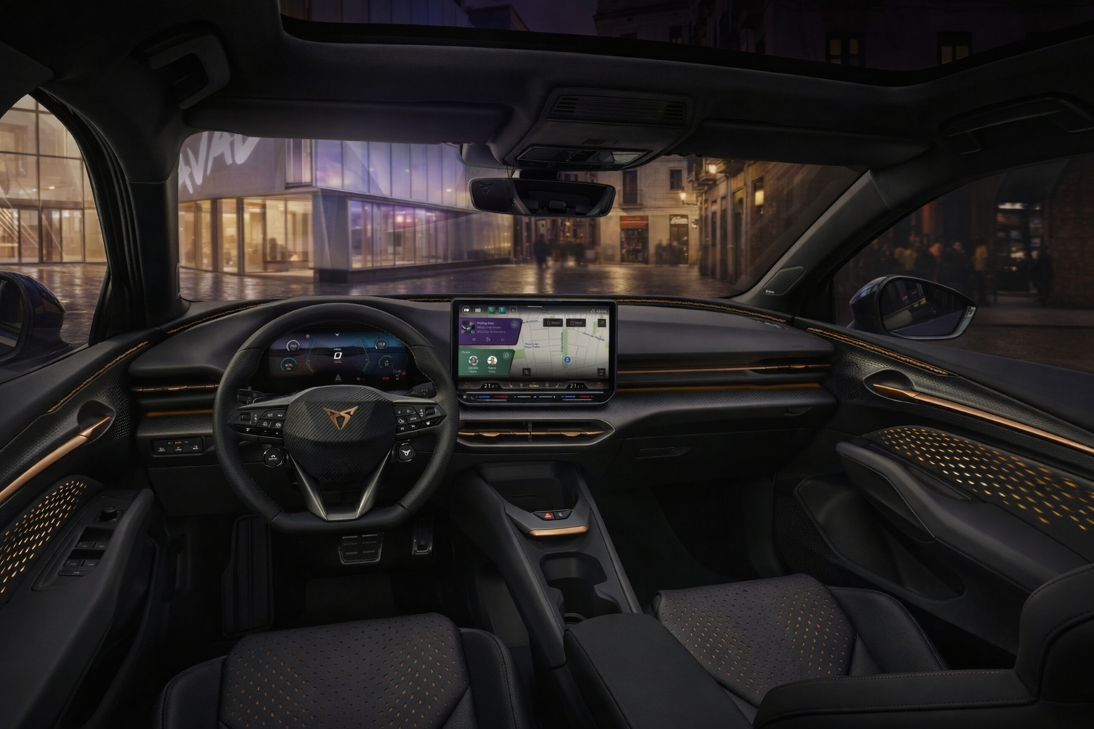 Интерьер выполнен в фирменном стиле CUPRA — с акцентом на водителя и эмоциональное восприятие.